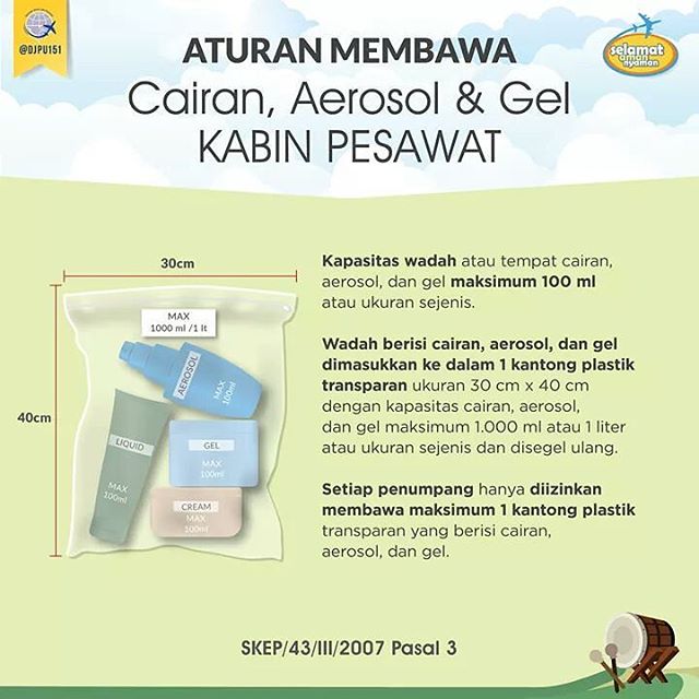 - Setiap calon penumpang pesawat udara hanya diijinkan membawa maksimum 1 (satu) kantong plastik transparan yang berisi cairan, aerosol dan gel.
